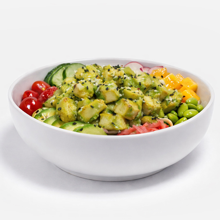 kurczak w sosie teriyaki, ryż, fasola edamame, awokado, mango, pomidorki cherry, ogórek, rzodkiewka, imbir marynowany, sezam